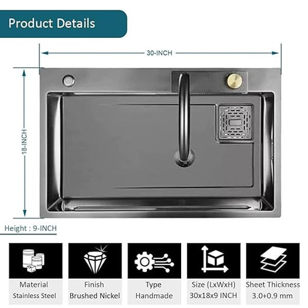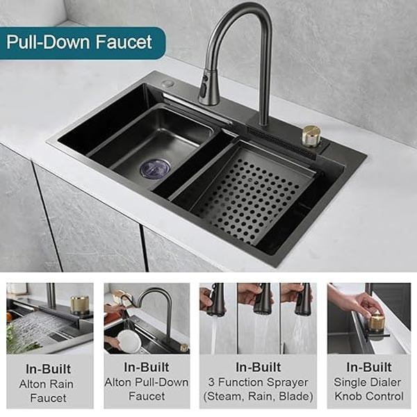 In-built Pull-Down Faucet: Enjoy the convenience of a steam and spray function in one faucet, offering versatile options for all your cleaning and cooking needs.
