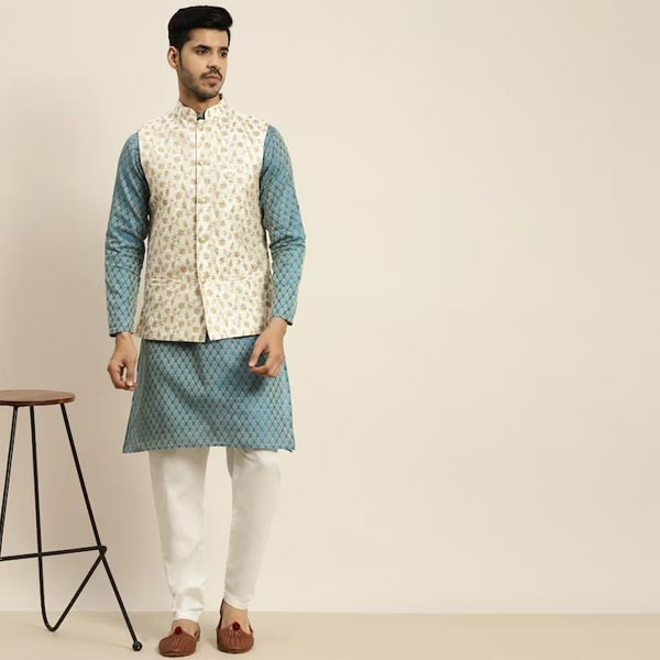 Blue woven design Kurta with Pyjamas Size & Fit The model (height 6') is wearing a size M Material & Care Kurta & Nehrujacket: Silk Blend (80% Silk, 20% Cotton), Bottom: 100% Cotton Machine Wash