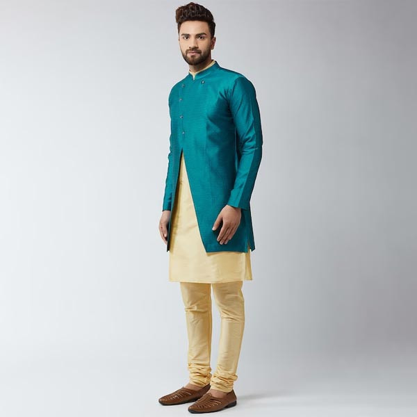Gold and blue sherwani with achkan Blue self design achkan, has a mandarin collar, long sleeves, a short button placket, and multiple slits Gold solid kurta, has a mandarin collar, a short button placket, long sleeves, straight hem, and side slits Gold solid pyjamas, has an elasticated waistband with a drawstring closure Size & Fit Regular Fit The model (height 6") is wearing size M Material & Care Silk Blend Dry Clean