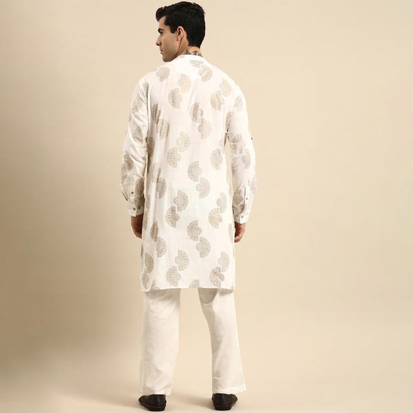 Off white printed Kurta with Pyjamas Size & Fit Size worn by the model: M Chest: 40" Waist: 32" Hips: 37.5" Height: 6' Material & Care Top fabric: Pure Cotton Bottom fabric: Pure Cotton Hand wash