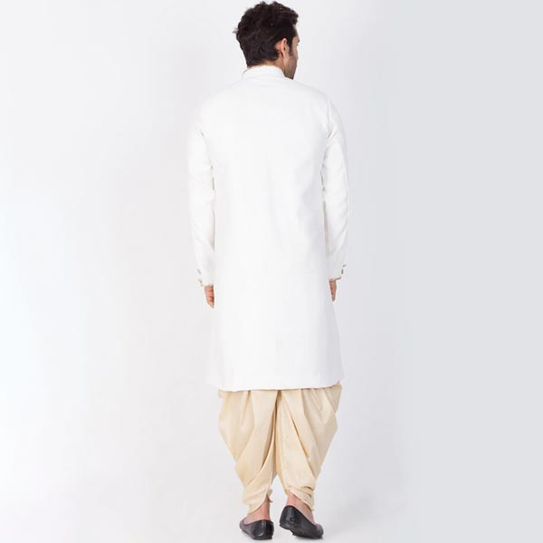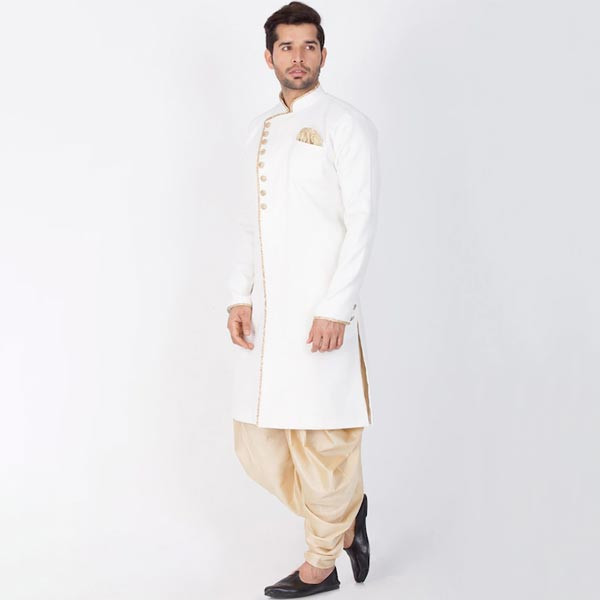 This sherwani set consists of a angrakha sherwani with dhoti White solid slim-fit angrakha sherwani with gold-coloured detail, has a mandarin collar, a full-front button asymmetric placket, long sleeves and multiple slits Beige solid dhoti pants with cowl and pleats, has an elasticated waistband with a slip-on closure Size & Fit Slim-fit The model (height 6') is wearing size S Material & Care Cotton Blend Dry-clean preferably or cold light wash