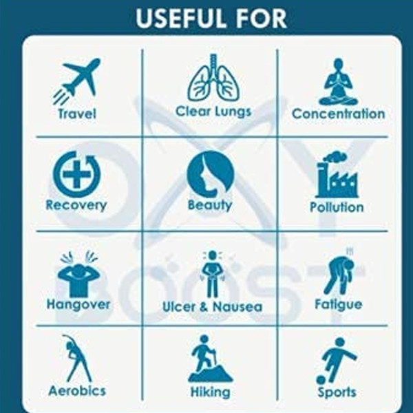 Portable: Can be easily carried because oxygen is weightless. Oxy Boost portable oxygen can helps in breathlessness during sudden shock, jerk, suffocation and choking. First of its kind: Disposable, safe and light weight Oxygen Can with an inbuilt mask. Extremely Easy to Use: Just place your chin on the surface of the mask and press the trigger with your hand or chin. Controlled Pressure: The air pressure or velocity reduces because of the mask which makes it an ideal choice and easy to use." "Portable: Can be easily carried because oxygen is weightless. Oxy Boost portable oxygen can helps in breathlessness during sudden shock, jerk , suffocation and choking. First of its kind: Disposable, safe and light weight Oxygen Can with an inbuilt mask. Extremely Easy to Use: Just place your chin on the surface of the mask and press the trigger with your hand or chin. Controlled Pressure: The air pressure or velocity reduces because of the mask which makes it an ideal choice and easy to use. OXY BOOST 9 Litres of pure oxygen 99% Pure in one can which offers 160 oxygen puff (approx.). Breathing Pure oxygen helps to restore oxygen levels and improve body function to normal for the people require pure oxygen. Now the world has got easy access to pure fresh natural oxygen.