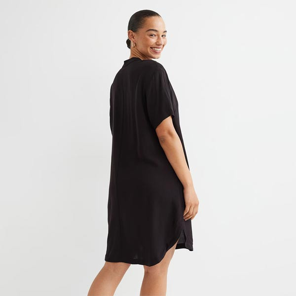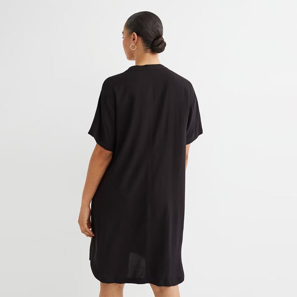 Tunic in a viscose weave with a small stand-up collar and V-neck opening at the front. Dropped shoulders, short sleeves and a rounded hem with slits in the sides. Slightly longer at the back. Unlined.